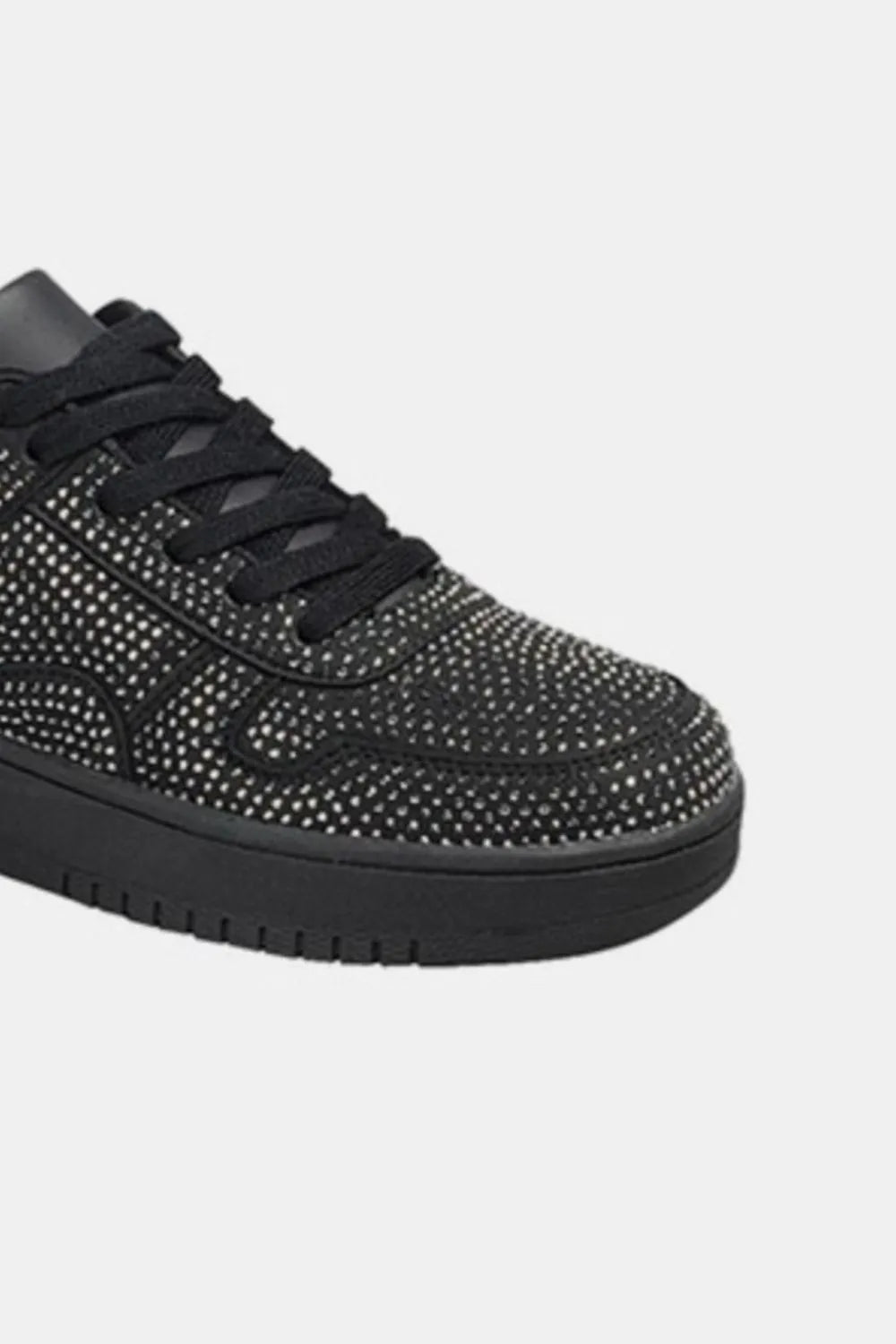 Rhinestone platform flat sneakers are the perfect blend of comfort and bling. The elevated platform provides extra support, making them ideal for all-day wear. Adorned with sparkling rhinestones, they add a fun, eye-catching detail to any casual outfit. These sneakers can effortlessly elevate your look, whether paired with jeans, shorts, or a sundress. Available in various colors, they offer versatility for any occasion. Step out in style and shine with these fashionable and comfy sneakers!